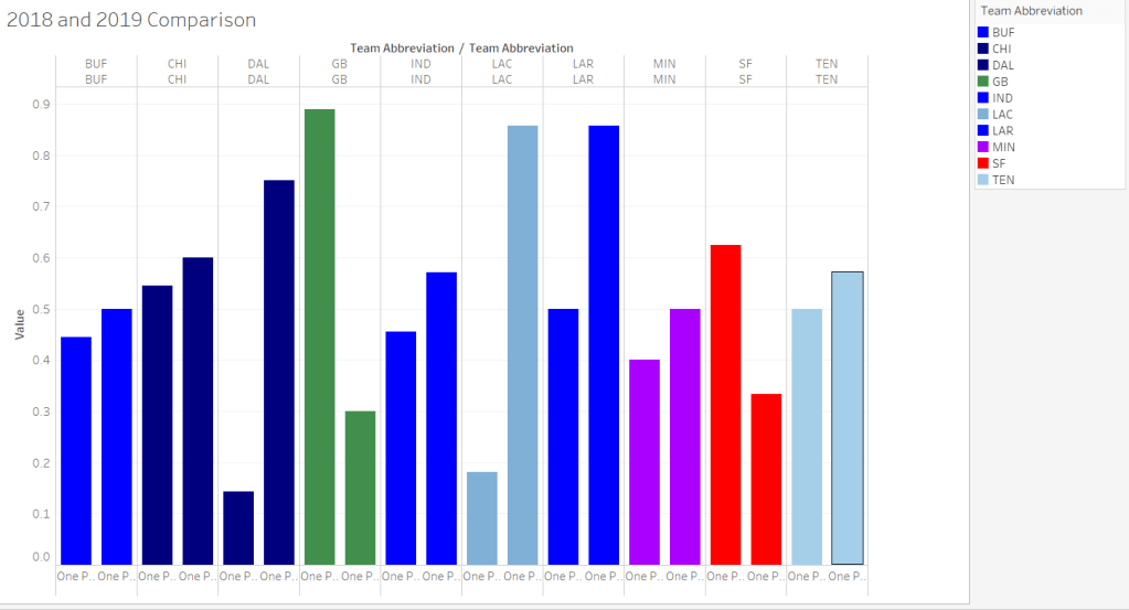The 2019 win percentage in one-possession games is on the left, with the 2018 win percentage on the right. The clear thing to see is the stark difference in one-possession performances; for example, the Los Angeles Chargers, Dallas Cowboys, and Los Angeles Rams all witnessed a steep drop in their performance in that metric (and subsequently all missed the postseason), while Green Bay and San Francisco saw a huge rise, two teams that clinched a playoff berth. While this is not perfect (Buffalo, Minnesota, and Tennessee all performed worse in one possession games last season, yet made the playoffs), every single team who made the playoffs in 2018, yet missed the postseason in 2019, performed worse in one-possession games.