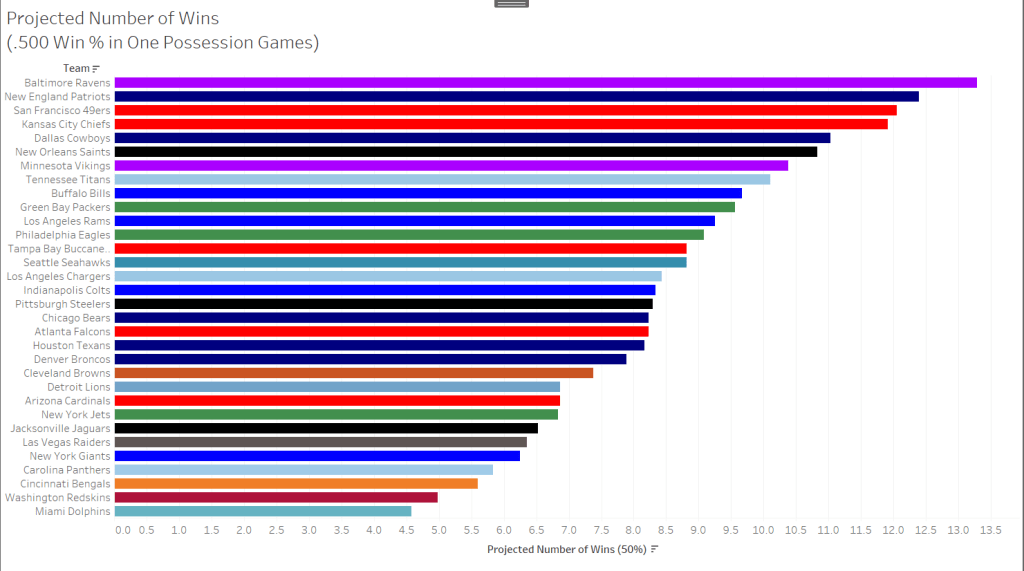 With all the above analysis described in detail, it is finally time to pivot to the 2019 data and try to make predictions for the 2020 season. We’ll be utilizing the same “lucky” and “unlucky” labels and criteria, but I wanted to throw one more illustration in at the beginning. If every team would have performed to a .500 record in their one-possession games, here would’ve been the projected win totals last season based on our statistical model: