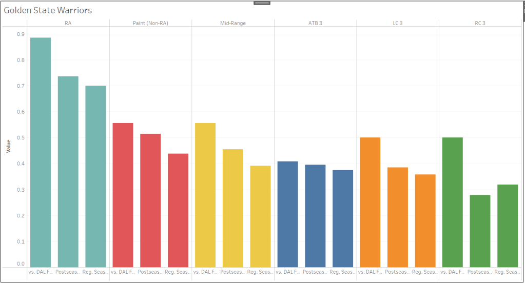 While the Warriors got great looks in Game 2, they are on quite the hot streak to begin this series. Check out our graph below that illustrates Golden State’s shooting splits from the major areas on the court across the regular season, postseason, and this series against Dallas: