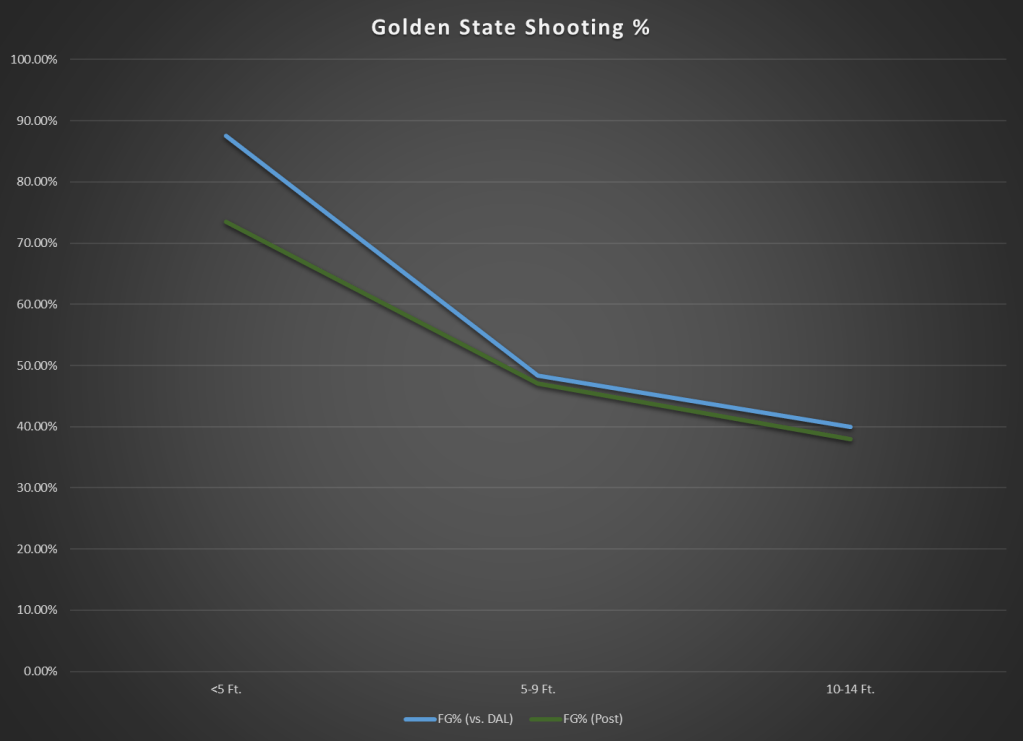 A lot of this can be chalked up to Dallas’ relative lack of rim protection, especially compared to Golden State’s most recent opponent, the Memphis Grizzlies. However, there is a portion of this that is explained by shooting variance. The Warriors will likely cool off from all areas of the court, but particularly around the rim. Considering how little resistance Dallas offered on Golden State’s penetration last game, I expect it to be a major point of emphasis for the Mavericks in Game 3.