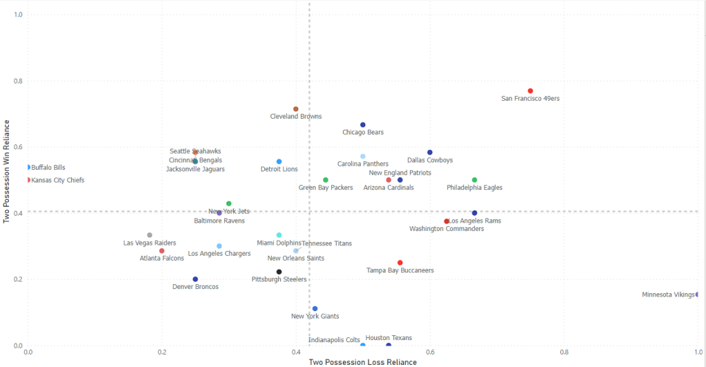 - I wouldn’t overreact too much to the bottom-right quadrant, where we see Dallas, San Francisco, and Philadelphia all here. The bulk of these three teams’ losses came by two or more possessions, but each had a small number of losses (Dallas the most with 5), and all had unique circumstances. I’d argue these teams all should’ve performed better in terms of competitiveness in losses last year.